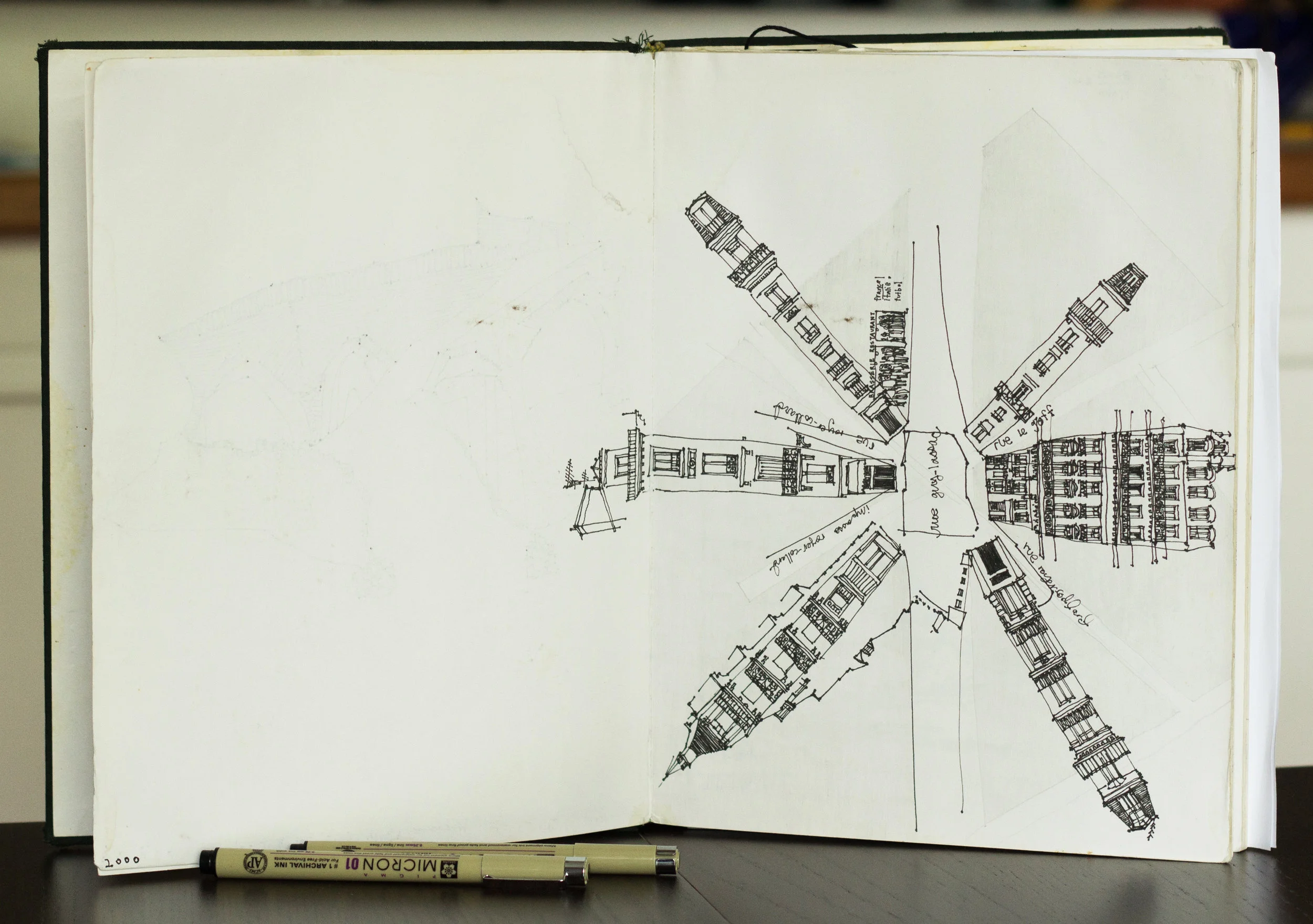 I learned to draw while traveling Europe as an architectural student. Among the old stone hillside towns, I concocted a way of drawing that combined plan, section and elevation which suited my desire to express the feeling, the experience, of the place, not just to replicate what I saw in a single glance, like a photograph. I call this "experiential drawing." I'd often walk through a place while sketching as my drawing sprawled over the pages. So, in all of my work since then, I've wanted to convey the experience of a place. This element of movement in experiential drawing begs for a recording of place - a MAP! I think my travel sketching was the germination of my need for maps.