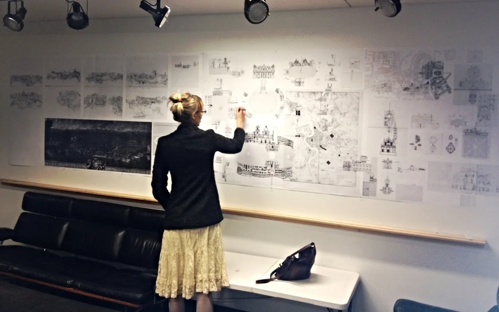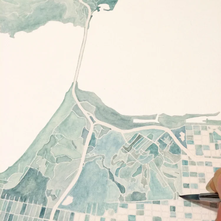 I try not to be slavish in representing the city precisely at a moment in time. Cities change and I love this...studying old maps through time to see those changes is fascinating and revealing. An emotional tie to a city is usually what brings clients to commission a map from me and my job is to capture the essence of the city - it's shape, iconic landmark sites and relationships between land, water, topography. I love feeling that I am having some intimate moments with a city as my brush traces the corners of each block, then fills it in. I am imagining what buildings are there, who owns the land, what kind of history is held in this block. Sometimes I know, but often I am just imagining. The whole experience transports me to another place - this city, but my lived and imaginary experience of this city.